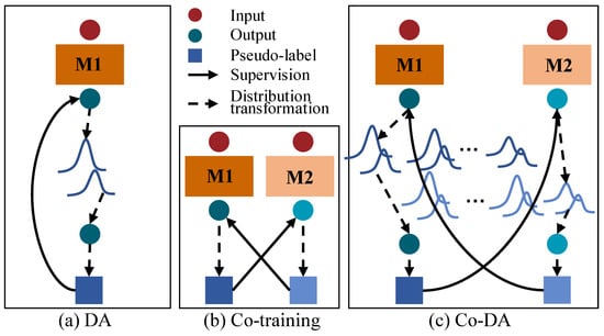 Equation (2) shows that pseudo-labels determine our optimization objective. Therefore, most existing methods [,] focus on correcting or generating more accurate pseudo-labels to supervise unlabeled predictions. However, their methods neglect the fundamental challenges of learning from imbalanced data and the distribution mismatch between labeled and unlabeled data. In the next section, we introduce the proposed Co-DA that specifically addresses these problems.