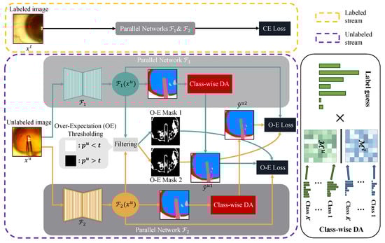 Overview of Co-DA for semi-supervised medical image segmentation, which consists of a stream for labeled data and a stream for unlabeled data. and are two parallel networks with the same architecture but different initializations. For labeled data, the standard cross-entropy loss (CE Loss) is used. For unlabeled data, and are pseudo-labels given by Equation (8), and we use the aligned output distribution from one network to supervise the other one. For the over-expectation cross-entropy loss (O-E Loss) in Equation (10), denotes the class probability corresponding to the pseudo-labels, t stands for the threshold given by Equation (9) and the O-E Masks are the thresholded binary masks to filter out pixels with low confidence in their pseudo-labels. We use class-wise DA to align marginal distributions for each class to better deal with imbalanced datasets. Here, and denote the labeled and the unlabeled marginal distributions.