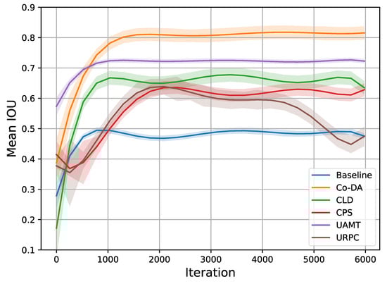 Trends in mIoU on the LGE-MRI dataset with 20% labeled data. It is clear that Co-DA not only provides the best performance, but also trains more quickly than most other methods, requiring a smaller number of training iterations. Additionally, the performance is stable once peaked.