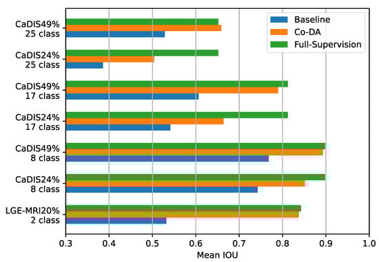 Firstly, we compare Co-DA with the fully supervised settings on both CaDIS and LGE-MRI and present the results in Figure 7. In many cases, the performance of Co-DA is very close to the fully supervised setting, demonstrating the outstanding efficacy of class-wise distribution alignment. Specifically, with 49% labeled data, Co-DA provides only slightly lower mIoU on CaDIS Tasks 1 and 2 as compared to the fully supervised setting. It even marginally outperforms the fully supervised case on Task 3, which means the refined pseudo-labels have a superior quality.