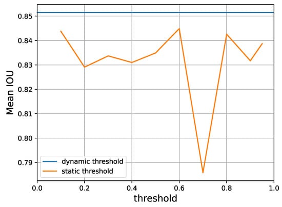 A performance comparison of static thresholds versus the dynamic threshold that our method adopts, according to Equation (9) on Task 1 of the CaDIS dataset with 24% labeled data. It is clear that the dynamic threshold provides superior mean IoU.