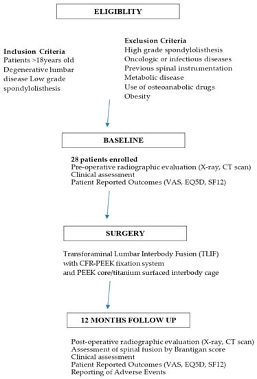 The osteoconductive properties of CFR-PEEK are considered to also be optimal for pedicle screw anchorage because stress and strain gradients may be minimized at the screw–bone interface, thus improving short-term primary stability and enhancing long-term secondary stability throughout osteointegration. Several preclinical in vitro studies have confirmed this idea; they have reported higher axial pullout strength for CFR-PEEK poly-axial pedicle screws compared with titanium screws [] and reduced screw loosening when used for the semi-rigid stabilization of osteoporotic spines []. Based on these advantageous characteristics, we proposed conducting a pilot study on degenerative lumbar patients that were entirely treated using CFR-PEEK instrumentation.