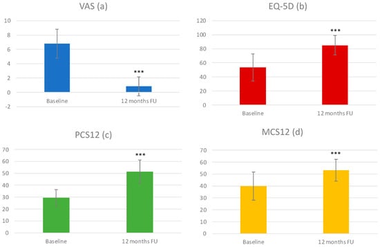 Moreover, at 12 months follow-up, all clinical outcomes improved as reported in Figure 1. The VAS score decreased from 6.81 ± 2.01 to 0.85 ± 1.32 (Figure 1), the EQ-5D score increased from 53.4 ± 19.3 to 85.0 ± 13.7 (Figure 1), the SF-12 physical component score (PCS) increased from 29.35 ± 7.04 to 51.36 ± 9.75 (Figure 1), and the SF-12 mental component score (MCS) increased from 39.89 ± 11.70 to 53.24 ± 9.24 (Figure 3).