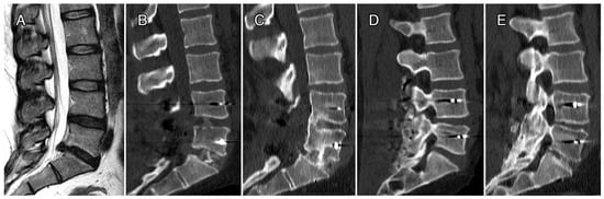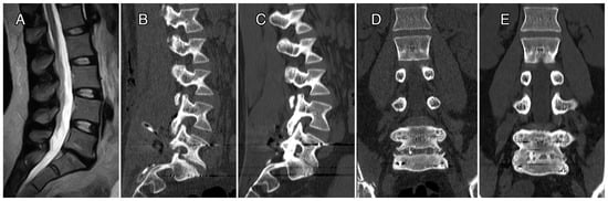 In Figure 4 and Figure 5, we reported radiographic imaging concerning two cases of patients affected by DD that were treated with CRF-PEEK posterior instrumentation and TLIF. In the first case, the levels treated were L4–S1, and in second case, they were L5–S1. In both cases, we can observe the presence of a relevant posterior fusion (Figure 4 and Figure 5, panels D) and interbody fusion (Figure 4 and Figure 5, panels E) at 12 months follow-up.