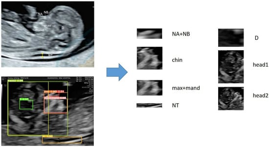 The examination section used in this study is the median sagittal section, which includes anatomical structures such as NT (nuchal translucency), NB (nasal bone), nasal tip, jawbone, and cranial crest, which are used in clinical diagnoses of high-risk fetuses [,]. Considering that the nasal tip, nasal bone, maxilla, and mandible have positional relationships, this study included them in the same region of interest. In addition, because the brain contains complex positional information, it is also considered a region of interest. Although the diencephalon is not related to screening for genetic disorders, it is an important anatomical structure in this section. Additionally, our study attempts to extract this anatomical structure to explore the feasibility of extracting key anatomical structures. In summary, this section divides the regions of interest that need to be extracted based on clinical diagnostic experience, and the detailed information is shown in Figure 1.