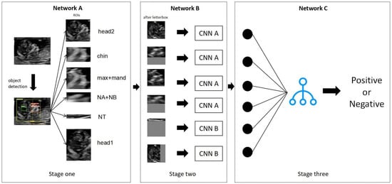 The training of Networks A, B, and C involved three stages. Initially, Network A was utilized to extract the ROI. Subsequently, CNN A and CNN B were employed to predict the disease probability for each ROI. Finally, the predictions from each network were combined using XGBoost to achieve an overall classification performance.
