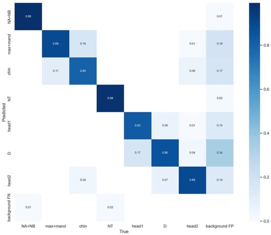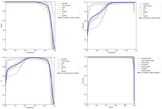 As shown in Figure 4 and Figure 5 and Table 2, Yolov5 with the enhancements of BiFPN and ECA achieved improved performance compared to the baseline Yolov5. The results for mAP, recall, and precision are as follows: In the “Chin” class, the mAP remained at 0.996, while the recall showed improvement to 0.800 and the precision slightly decreased to 0.702. Similarly, for the “head1” class, the mAP remained at 0.996, with an improved recall of 0.830 and a consistent precision of 0.800. In the case of the “head2” class, the mAP remained at 0.996, with an increased recall of 0.890 and a slightly lower precision of 0.781. For the “D” class, the mAP remained at 0.996, the recall improved to 0.860, and the precision decreased to 0.610. The “NA + NB” class maintained a mAP of 0.992, with unchanged recall and precision values of 0.990 and 0.980, respectively. Likewise, the “max + mand” class maintained a mAP of 0.996, with a consistent recall of 0.990 and a slightly decreased precision of 0.712. The “NT” class showed an improved mAP of 0.950, while recall and precision remained at 0.980. Lastly, for all classes combined, the mAP remained at 0.986, with a steady precision of 0.988.