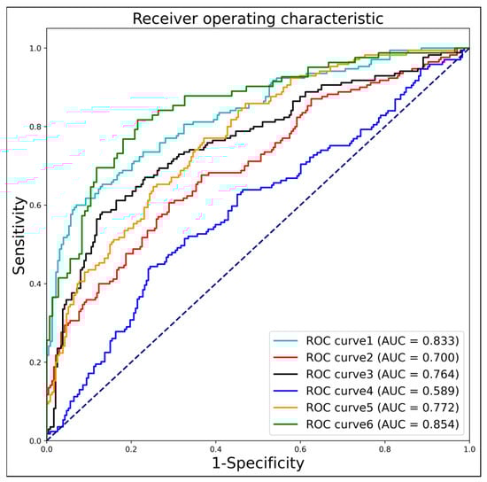 The Table 3 and Figure 6 represents the screening performance of different ROI areas for genetic disorder detection. The metrics evaluated include AUC, sensitivity, specificity, accuracy, and F1 score. For the “chin” ROI, the AUC is 0.833, indicating a reasonably good performance. The sensitivity is 0.594, suggesting that it correctly identifies positive cases around 59.4% of the time. The specificity is high at 0.930, implying a low false-positive rate. The accuracy is 0.786, representing the overall correctness of the predictions. The F1 score, which combines precision and recall, is 0.704. Similarly, for other ROIs, such as “head1,” “head2,” “max + mand,” “NA + NB,” and “NT,” the corresponding metrics are provided. These include AUC, sensitivity, specificity, accuracy, and F1 score. From the table, we can observe that different ROIs exhibit varying levels of screening performance. For instance, “head2” has a relatively higher AUC of 0.764 and sensitivity of 0.576, indicating better discrimination and a higher ability to correctly identify positive cases compared to the other ROIs. On the other hand, “max + mand” has a lower AUC of 0.589 and sensitivity of 0.438, suggesting a comparatively weaker performance in detecting genetic disorders.