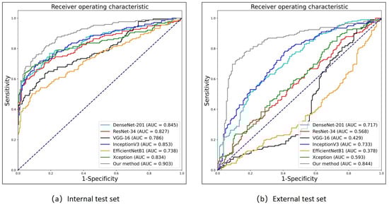 In terms of performance, FGDS achieves an AUC of 0.903, indicating excellent discrimination ability. It demonstrates a sensitivity of 0.753, which suggests that it correctly identifies 75.3% of positive cases. The specificity of FGDS is 0.889, indicating a relatively low false-positive rate. Furthermore, the F1 score of 0.790 reflects a balanced precision and recall. DenseNet-201 achieves an AUC of 0.845 with a sensitivity of 0.763. It maintains a relatively high specificity of 0.807, resulting in a balanced performance with an F1 score of 0.756; ResNet-34 shows an AUC of 0.827, a sensitivity of 0.655, and a high specificity of 0.888. However, the F1 score is slightly lower at 0.727 compared to the previous models; VGG-16 achieves an AUC of 0.786 with a sensitivity of 0.633. The specificity is 0.833, indicating a relatively low false-positive rate. The F1 score is 0.683, reflecting a trade-off between precision and recall; InceptionV3 demonstrates an AUC of 0.853 and a sensitivity of 0.712. It maintains a specificity of 0.867, resulting in an F1 score of 0.754; EfficientNetB1 exhibits the lowest AUC of 0.738 and a sensitivity of 0.497. However, it demonstrates a high specificity of 0.914, resulting in an F1 score of 0.617; Xception achieves an AUC of 0.834 with a sensitivity of 0.638. It shows a high specificity of 0.953, resulting in an F1 score of 0.751.
