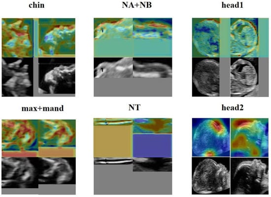 Deep learning has often been considered a high-risk approach in medical decision-making due to its lack of interpretability. To address this concern, we utilized the Grad-CAM to generate heatmaps, highlighting the anatomic structure that significantly contribute to the model’s classification. These heatmaps effectively pinpointed areas which played a crucial role in the classification process. Importantly, we also presented the heatmaps of individual subgraphs within the model, providing a comprehensive understanding of the evaluation basis from different perspectives. Network A also demonstrates that FGDS accurately recognizes the anatomical structure of the fetal face, achieving an average precision of 0.988 across all classes. As illustrated in Figure 7 and Figure 8, the “head2” region of interest in Network B displayed heightened sensitivity to the middle and lower face, while the “chin” exhibited a finer depiction of the development of the nasal bone, jaw bone, and other facial components. “head1”, on the other hand, showed greater sensitivity to the frontal bone and hindbrain. This interpretable feature holds potential for its integration into complementary medicine, facilitating a more comprehensive understanding and evaluation of complex cases.