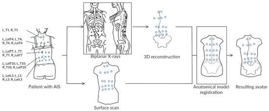 The resulting model skin surface matches the pose of the back surface during the X-ray acquisitions. Thus, we create a synced skin and spine model by disregarding the temporal parameters and associating the current optimized skin to the original model parameters obtained during the first registration process. As a result, the anatomical model is a numerical twin of the patient, including the skeleton and the skin rigged with common model parameters. The association of the skin and spine is performed on the pose observed during the X-ray acquisitions with the help of the radio-opaque markers. Given a new set of markers, the model parameters can be optimized using Equation (1) and obtain the skin model matching the input markers, as well as a prediction of the spine geometry inside the body.