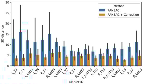 Distance error per marker from the resulting model to the radiograph positions. We compare a simple rigid registration of the skin to the radio-opaque markers using RANSAC (blue) with an additional step of pose correction using a kinematic model (orange).
