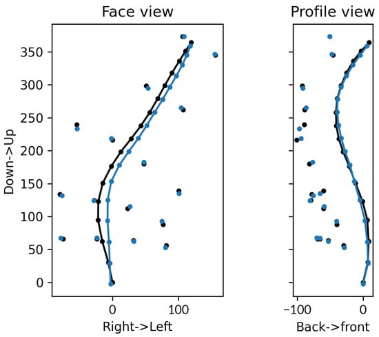 Predictions (blue) against the ground-truth (black) on the coronal and sagittal planes (scale in mm). The free dots represent the marker positions and the connected ones the vertebrae.