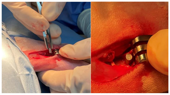To facilitate surgery, rabbits were pre-medicated with 0.1 mg/kg hydromorphone (Hydromorphone HCl injection 2 mg/mL, Baxter Healthcare Corporation, Deerfield, IL, USA) and 1.0 mg/kg midazolam (Midazolam HCl injection 5 mg/mL, Akorn, Lake Forest, IL, USA) intramuscularly (IM) and provided inhalant oxygen and gas anesthesia (isoflurane) via face mask. Following pre-medication, rabbits had intravenous (IV) catheters placed in a lateral ear vein, were intubated, and had anesthesia maintained with inhalant oxygen and isoflurane, a constant rate infusion (CRI) of 50 µg/kg/minute lidocaine (Lidocaine HCl injection 10 mg/mL, Pfizer, Inc. Lake Forest, IL, USA) IV, and an intra-operative dose of 0.05 mg/kg hydromorphone IV. Experimental metal alloy implants were surgically implanted into NZW rabbits (n = 6) utilizing an established rabbit femoral condyle defect model [43,44,45,46], see Figure 1. The surgical procedure was as follows: a 2.0 cm skin incision was created on the lateral aspect of the left hindlimb, overlying the distal femur, approximately 0.5 cm caudal and parallel to the lateral trochlear ridge of the femur. A 1.0 cm myotomy was performed to expose the bony surface of the lateral femoral condyle. Once exposed, two unicortical 3.0 mm drill holes were created and immediately filled with either a coated or uncoated experimental implant. Each type of implant (coated, uncoated) was placed into each of the defects as determined randomly (1 of each type of implant in every rabbit). Implants were assigned to either the proximal (closer to the diaphysis) or distal (closer to the knee joint), referring to their location within the distal femur. Surgical sites were closed with 5-0 monofilament sutures (PDS, Ethicon Inc. Raritan, NJ, USA) in standard fashion. Also, one coated sample and one uncoated sample were implanted subcutaneously in a few rabbits to provide additional information on the degradation rates of the two tested groups. Immediately post-operatively, 1 mg/kg of meloxicam (Meloxicam 5 mg/mL solution for injection, Boehringer-Ingelheim Vetmedica, St. Joseph, MO, USA) was administered subcutaneously (SQ) and 5 mg/kg of enrofloxacin (Enrofloxacin antibacterial injectable solution 2.27%, Dechra, Overland Park, KS, USA) was administered SQ to prevent post-operative discomfort and infection, respectively.
