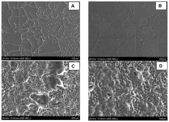 SEM imaging of the surface microstructure for uncoated and MAO-coated samples of Mg-1.2Zn-0.5Ca alloy; (A) shows the as-cast microstructure, (B) shows the as heat-treated microstructure with a finer dispersion of the secondary intermetallic phases into the grains, and (C,D) show the porous MAO coating layer on the coated group.