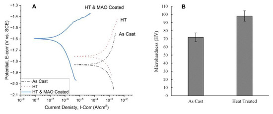 (A) PDP Tafel curves comparison between different Mg-1.2Zn-0.5Ca-0.5Mn alloy groups (as-cast, heat-treated, heat-treated and MAO-coated), showing an enhancement in the corrosion characteristics after heat treatment and a significant enhancement after the MAO coating. (B) microhardness measurements of different Mg-1.2Zn-0.5Ca-0.5Mn alloy groups (as-cast and heat-treated), showing a significant enhancement in the microhardness after heat treatment.