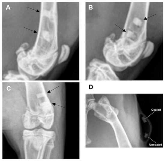 Radiographs demonstrating presence and location of experimental implants. (A) Laterally oriented radiographic image (rabbit #24, timepoint = one month). (B) Laterally oriented radiographic image (rabbit #25, timepoint = one month). (C) Cranial-caudally oriented radiographic image (rabbit #27, timepoint = two months). Black arrows aimed at experimental implants within the bone (distal femur). (D) Radiographs demonstrating faster degradation rates for the uncoated implants with pocket resulting from hydrogen evolution (rabbit #27, timepoint = one month).