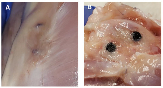 Representative images of post-mortem examinations. (A) Image displays the superficial portions of two experimental implants that are within the bone of a partially dissected left hindlimb. Implants are still covered with connective tissue. (B) Image displays two experimental implants within bone (distal femur). Connective tissue has been dissected to expose bone and implants.