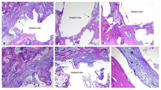 Histology images of bone sections containing uncoated implants, one-month timepoint. H&E-stained sections of bone samples demonstrate defects (with implant removed) visualized as (relatively) circular areas of empty (white) space, surrounded by tissue (bone, connective tissue, adipose). (A,D): Evidence of fibrous connective tissue formation around edge of implant site with moderate lymphoplasmacytic infiltration. (A): 5× magnification, (D): 10× magnification. (B,C): Minimal connective tissue formation within implant site. (B): 5× magnification, (C): 10× magnification. (E,F): Evidence of moderate fibrous connective tissue formation and moderate lymphoplasmacytic cellular infiltration. E: 5× magnification, (F): 10× magnification. Black arrows aimed at areas of (fibrous) connective tissue. Implant sites labeled “implant site.”