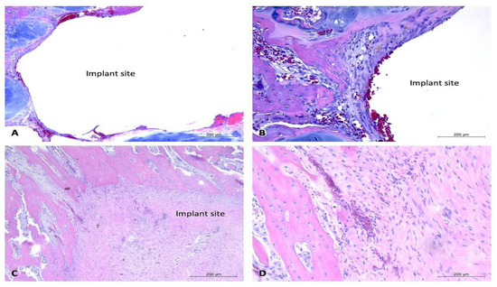 Histology images of bone sections containing coated implants and soft tissue response to uncoated implants, one-month timepoint. H&E-stained sections of bone samples demonstrate defects (with implant removed) visualized as (relatively) circular areas of empty (white) space, surrounded by tissue (bone, connective tissue, adipose, and cartilage). (A,B): Demonstrate bone defect site with minimal connective tissue formation and mild lymphoplasmacytic cellular infiltration. Vascularization prominent throughout connective tissue. (A): 5× magnification, (B): 10× magnification. (C,D): Section containing bone defect site and overlying soft tissues. Demonstrates vascularization throughout soft tissues and presence of healthy connective tissue with minimal evidence of lymphoplasmacytic cellular infiltration. (C): 5× magnification, (D): 10× magnification. Black arrow aimed at connective tissue. Implant sites labeled “implant site.”