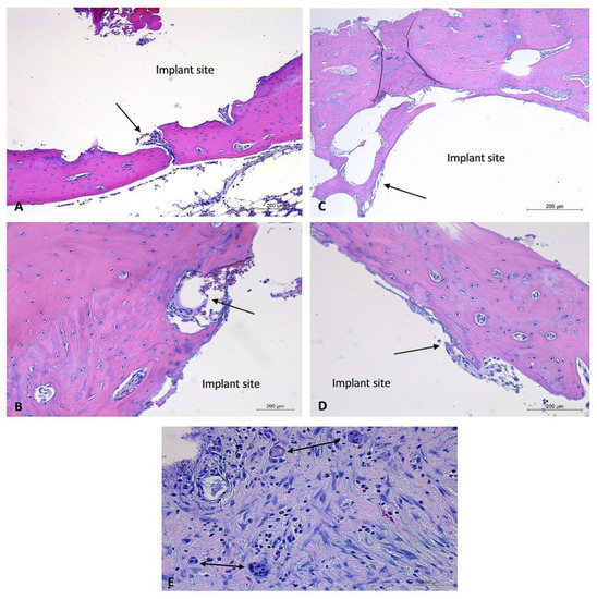 Histology images of bone sections containing coated and uncoated implants and soft tissue response to coated and uncoated implants at two-month timepoint. H&E-stained sections of bone samples demonstrate defects (with implant removed) visualized as (relatively) circular areas of empty (white) space, surrounded by tissue (bone, connective tissue, adipose). (A,B): Bone defect site that previously contained an uncoated experimental implant. Minimal connective tissue formation and mild lymphoplasmacytic cellular infiltration. Vascularization prominent throughout connective tissue. (A): 5× magnification, (B): 10× magnification. (C,D): Bone defect site that previously contained a coated experimental implant. Minimal connective tissue formation and mild lymphoplasmacytic cellular infiltration. (C): 5× magnification, (D): 10× magnification, (E): soft tissue response to uncoated implant. Demonstrates moderate lymphoplasmacytic infiltration and presence of multiple multinucleated giant cells. Black arrows aimed at connective tissue. Implant sites labeled, “implant site.” Double-headed black arrows aimed at multinucleated giant cells.