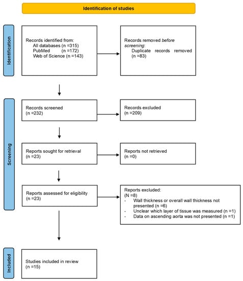 Using the search strategy, we retrieved 172 articles from PubMed and 143 from the Web of Science. After removing the duplicates (n = 83), 232 articles were screened, resulting in 23 eligible studies for full-text analysis. The study selection process is illustrated in Figure 1. After a review of the full articles, eight articles were excluded from analysis because wall thickness or overall wall thickness was not presented (n = 6), it was unclear which layer of tissue was measured (n = 1) or data on the ascending aorta were not presented (n = 1). This resulted in 15 studies, with a total of 1556 ATAA tissue samples, which were included in this review [15,16,17,18,19,20,21,22,23,24,25,26,27,28,29].