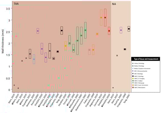 The included studies reported several different wall thickness measurement methods. These methods consisted of an eyepiece micrometer, laser micrometer, line laser triangulation sensors, histomorphometry, digital caliper, electronic caliper, dial gauge, epiaortic ultrasound, measurement trough metal plate, and electronic image analysis. For each measurement method, the wall thickness measurements were further divided into intima-media thickness (IMT) and intima-media-adventitia thickness (IMAT) measures. The ranges of medians of wall thickness measurements for aneurysm patients with different measurement modalities were as follows: medical images 1.3–2.5 mm (IMT), histology 1.3–1.67 mm (IMT) and 1.6–2.5 mm (IMAT), and fresh tissue 1.7–3.1 mm (IMAT). On the other hand, histology IMAT was obtained (range: 1.7–2.6 mm) for NA patients (Figure 2).