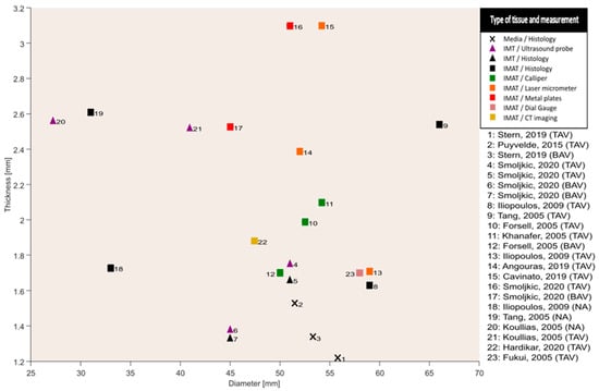 In Figure 3, wall thicknesses were plotted against the diameters for every study. The wall thicknesses shown in the figure were the result of a combination of multiple wall thickness measurement methods as described previously. The range of IMT was 1.3–2.5 mm, and IMAT ranged from 1.6 to 3.1 mm. The corresponding ranges of diameters were 40.9–51.0 mm and 45.0–66.0 mm. The measurement ranges included samples from patients with bicuspid and tricuspid aortic valves.