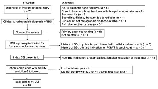 Inclusion and exclusion criteria. * Pain due to other causes: osteoid osteoma (n = 1), popliteal artery entrapment (n = 1), avascular necrosis of second metatarsal head (n = 1) ** History of metatarsal BSI, treated with ESWT for peroneal tendinopathy (n = 1); history of tibial BSI, treated for tibialis posterior tendinopathy (n = 1); history of calcaneal BSI, treated for concurrent peroneal and tibialis posterior tendinopathy (n = 1).