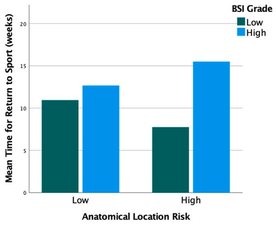 Return to run time (in weeks) by BSI grade and anatomical location risk. Low-risk anatomical locations had an average return to run time of 10.9 ± 9.3 weeks (low grade, n = 17) vs. 12.7 ± 9.6 weeks (high grade, n = 15, p = 0.594). In high-risk anatomical locations, low-grade (n = 4) had an average return to run of 7.8 ± 7.1 vs. high-grade (n = 5) 15.5 ± 14.4 weeks (p = 0.335).