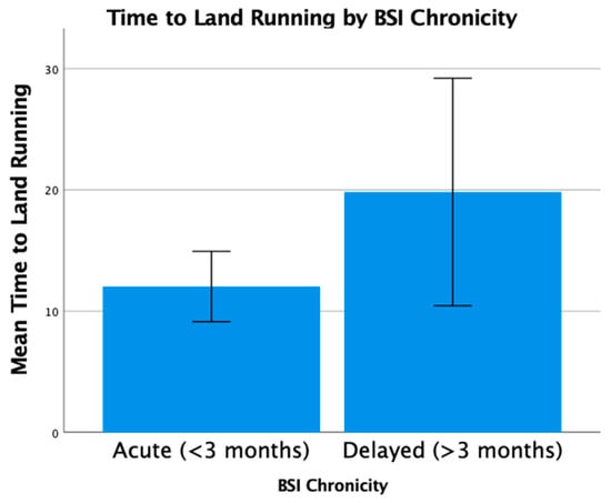 Time to return to land running from beginning shockwave treatment (in weeks) by BSI chronicity. Acute BSI (treatment < 3 months from diagnosis, n = 28) had an average return to land running at 12.0 ± 7.5 weeks, while runners with delayed or non-union (n = 12) required an average of 19.8 ± 14.8 weeks (p = 0.032).