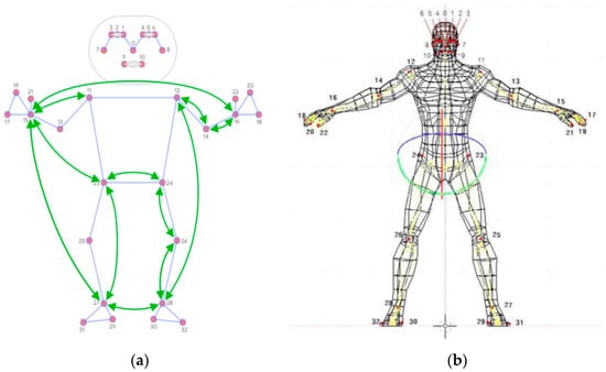 Main pairwise distances used for the pose feature vector; (a) a simplified version of the human body model that can be used to represent the kinematics that the camera typically recognizes, with each joint represented by a red dot and the arrow indicating the direction of the joint moment that can be recognized; (b) in general, the authors of this paper have modified and created an evolved human body model that can be used to represent camera-perceived kinematics in a more complex and three-dimensional form. Each joint is labeled with a generalized number, and arrows indicate the direction of the joint moment that can be used to recognize motion.