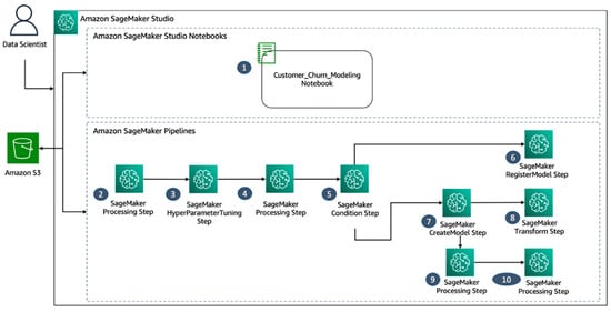 - Amazon Web Services. Build, Tune, and Deploy an End-to-End Churn Prediction Model Using Amazon SageMaker Pipelines. 2021. Available online: https://aws.amazon.com/ko/blogs/machine-learning/build-tune-and-deploy-an-end-to-end-churn-prediction-model-using-amazon-sagemaker-pipelines/ (accessed on 15 January 2023).