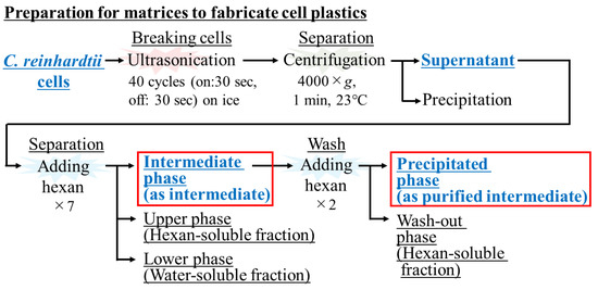 Chlamydomonas reinhardtii strain C-9: NIES-2235 was obtained from the National Institute for Environmental Studies. The strain was grown in a photo bioreactor (80 L; 25 °C; 150 µm·m−2·s−1; 15,000 ppm-CO2; 0.05 vvm) in a BG-11 medium [24], and the lyophilized cells were prepared by Meravi Ltd. The cells themselves were used as the resources of the cell plastics and were manipulated to prepare the matrices.
