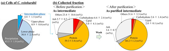 Collection ratio of the cell contents and composition ratios of the intermediate and purified intermediate. Composition ratios of the (a) cells (b) collected phases before/after hexane purification were evaluated with carbohydrates, lipids, proteins, ashes, and others. Both collected phases were derived from the intermediate phase of cells, and both were defined as intermediate and purified intermediate before/after hexane purification. The averaged value and standard deviation (SD) were shown by six-replicated experiments (n = 6).
