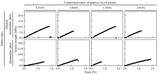 All these phases were collected from an organic phase, an intermediate phase, and an aqueous phase by the addition of hexane that could not be made into films. Each phase was mixed with cells as the matrix and the mixture was then prepared to fabricate the cell plastics, resulting in the mixture that only had an intermediate as the matrix being formed into cell plastics. Then, the cell plastics with different content ratios of intermediates were prepared, and those mechanical properties were analyzed in a tensile test (Table 1). The results showed that cell plastics containing only 0.5~2.0 wt% intermediate exhibited 227.3~422.1 MPa of Young’s modulus, 3.5~4.6 MPa of maximum stress, and 1.1~1.6% of strain. In detail, the maximum stress and strain showed no correlation with the content ratios of the intermediates; however, the Young’s modulus tended to reach its maximum value when the ratio of the intermediate was 1.5 wt%. The intermediate was additionally washed out with hexane, and the purified intermediate was collected. The purified intermediate was powdered and did not exist as an independent film. However, the powder of the purified intermediate could work as the matrix, meaning that the cell plastics were fabricated with them. The mechanical properties of these cell plastics were also analyzed by tensile test (Table 1), and it was shown that those cell plastics with only 0.5~2.0 wt% of the content ratios of the purified intermediates exhibited 550.1~564.4 MPa of Young’s modulus, 5.1~7.7 MPa of maximum stress, and 0.4~1.4% of strain. By using the purified intermediate as the matrix, although the strain of the cell plastics remained almost the same or tended to decrease slightly, the Young’s modulus and maximum stress tended to increase. The purified intermediates were used as the matrices and, as they were deeply related to the values of Young’s modulus, they tended not to scatter. On the other hand, the content ratios of the purified intermediate did not show a clear correlation with the values of the mechanical properties observed in the tensile test. To additionally evaluate how the mechanical properties of each cell plastic were reflected by the refining of the intermediate and content ratios of them as a matrix, the S–S curves obtained from the tensile test were analyzed (Figure 3). All the cell plastics exhibited an elastic range, and all failed at once after reaching the maximum stress value.