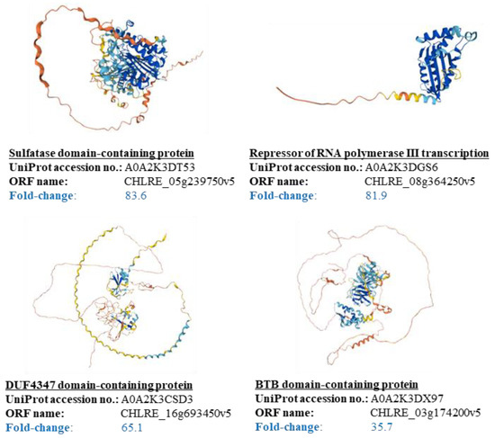 Proteomic analyses of C. reinhardtii have been performed on various targets, such as in the study of Stauber et al. for light-harvesting proteins [37], and by Diniz et al. for flagella [38]. On the other hand, however, this study is the first proteomic analysis that is targeted toward the remaining proteins after treatment with hexane (Figure 5). According to the database on UniProt (15 May 2023), 14,582 of the proteins in C. reinhardtii were set as ‘Predicted’, and there were 1298 proteins that were collected under the processes of sonication and hexane treatment, meaning that 8~9% of the total protein species were recovered in this study. Although not all proteins are always expressed, the fact that approximately only 2.8 wt% of proteins were recovered from the prepared cells suggests that they had a low recovery ratio of less than 10%, thus suggesting that a diverse number of proteins might have occurred due to the recovery method. The proteins detected in the purification intermediate were the nuclear-localized repressor of RNA polymerase III transcription (fold change: 81.9); the nuclear-localized UBC core domain-containing protein (fold change: 81.5); the protein kinase domain-containing protein localized to actin filaments (fold change: 41.7); and the C3H1-type domain-containing protein localized to cytoplasm (fold change: 35.7)—suggesting that the cells could be disrupted by the methods of sonication and hexane treatment. What was particularly interesting was that almost all the proteins could be clustered without any positive or negative difference in Z-score, even after repeated attempts. This indicates that the hexane purification worked reproducibly for the purification of these specific proteins, and this had a great impact on the results of the analysis.