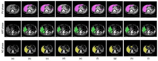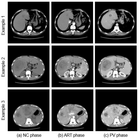 The death rate due to liver diseases caused by cancer, infection, excessive alcohol intake, and abnormal immune system function has been rising in recent years [1]. Multi-phase CT images are widely used to diagnose disease more accurately [2]. Multi-phase CT scans the human body at different time periods after injecting a contrast medium. The various phases of multi-phase CT images consist of the non-contrast (NC) phase, which is a native image captured prior to the injection of contrast [2], the arterial (ART) phase, which is an image acquired 15–35 seconds after contrast injection to enable visualization of the arteries, and the portal venous (PV) phase, which is an image obtained between 60–80 seconds after injection to visualize the portal venous. Typical multi-phase CT images with different liver lesions are shown in Figure 1. By analyzing the enhancement patterns of the multi-phase CT images, radiologists can make a better accurate diagnosis than the standard low-contrast single-phase CT [3]. Although multi-phase CT is convenient, the number of images that need to be checked increases, which in turn increases the burden on radiologists. As a result, demand for computer-aided diagnosis (CAD) systems is increasing. In this paper, we address automatic liver segmentation as an essential CAD system.