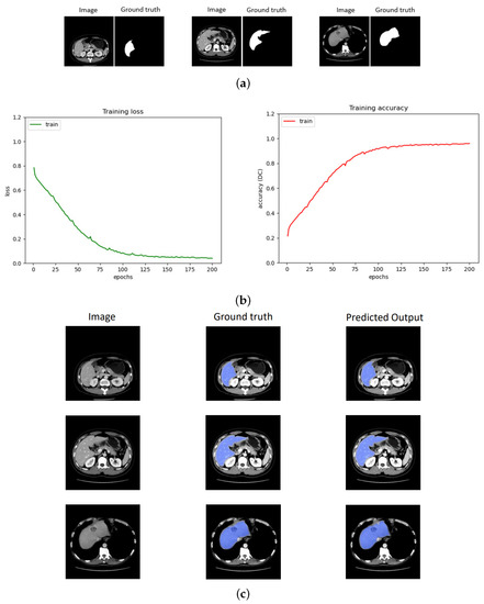 Illustration of the training process and the output prediction: (a) sample input images with mask, (b) training convergence using loss and accuracy, and (c) segmented final results.