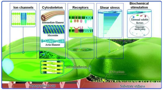 Apart from topography, mechanical stress is also a significant component of the host environment, as it influences the cellular signal transduction and the behavior of various cells. Flow-induced shear stress, in particular, influences mechanoreceptors, like ion channels and integrin/focal adhesions, as well as responses, such as nitric oxide and intracellular calcium production, and cytoskeletal remodeling [46]. Shear stress is applied at discrete local points and is transmitted through the cell body along cytoskeletal microstructures, which in turn trigger intracellular mechanical signaling. Thus, shear stress alters not only the cell’s shape but also the intracellular signaling pathways [1,47] (Figure 2).