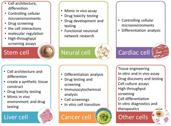 Utilizing the microfluidic technology discussed above, numerous microfluidic platforms applied to stem cells [62,63,64,65,66], tumor cells [67,68,69], and other types of cells [52,53,54,55,56,70,71,72,73]. Microfluidic platforms are designed for several specific applications including single-cell studies [74,75,76], biomarkers’ detection [77,78,79], drug screening and discovery [80,81,82], organs-on-chip [83,84,85,86,87,88,89,90,91,92], and tissue engineering [10,93,94].