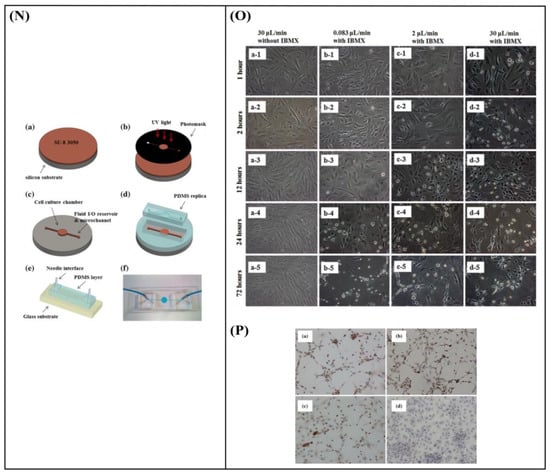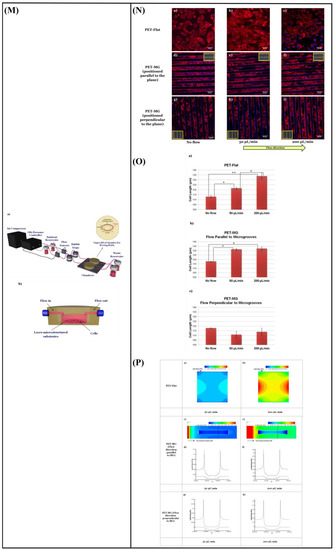 Babaliari et al. [148] have studied the combined effect of shear stress and topography on Schwann (SW10) cells’ behavior under dynamic culture conditions attained via continuous flow. For this purpose, a precise flow-controlled microfluidic system with specific custom-designed chambers incorporating laser-microstructured polyethylene terephthalate (PET) substrates comprising microgrooves [36] was developed. The microgrooves were positioned either parallel or perpendicular to the direction of the flow and the response of SW10 cells was evaluated in terms of growth, orientation, and elongation. The cell culture results were also combined with computational flow simulation studies employed to accurately calculate the shear stress values. It was revealed that, depending on the relation of the direction of the flow with respect to the topographical features, wall shear stress gradients were acting in a synergistic or antagonistic manner to topography in promoting guided morphologic cell response (Figure 10M–Q).