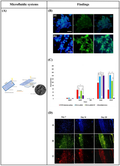 Specifically, Hesari et al. [146] fabricated a hybrid microfluidic system composed of a PDMS microchip and poly(lactic-co-glycolic acid) (PLGA) nanofiber-based substrate for differentiation of human induced pluripotent stem cells (hiPSCs) into neurons. The results revealed an increase in β-tubulin III (a specific neuronal marker) gene expression and a decrease in glial fibrillary acidic protein (GFAP) (a classic astrocyte marker) gene expression. Thus, this hybrid microfluidic system could be optimum for neuronal differentiation. Afterward, for further in vivo evaluation of this system, the cell-loaded scaffold was implanted in a spinal cord model of rats. During the 28 days of study, animals who received this implant displayed improved functional outcomes. However, the difference with the control group was not statistically significant (Figure 10A–D).