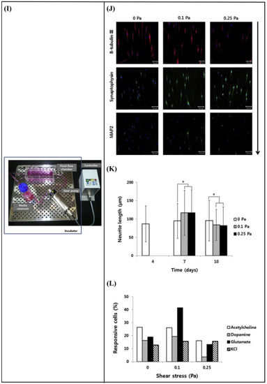 Kim et al. [1] developed a fluid flow system to study the effect of mechanical stimulation on PC12 cells cultured in microfiber-based substrates. They observed that the shear stress affected the length and orientation of neurons along the microfibers (Figure 10E–H). Furthermore, Jeon et al. [147] investigated the combined effects of topography and flow-induced shear stress on the neuronal differentiation of hMSCs. They applied different shear stresses in a PDMS substrate with micrometric grooves. The results demonstrated that shear stresses affected the expression of synaptophysin, β-tubulin III, and microtubule-associated protein 2 (MAP2), as well as the intracellular calcium concentration. The alignment was also confirmed. In addition to this, an increased neurite length was noticed on the seventh day. However, a significant decrease in neurite length was observed on the tenth day (Figure 10I–L). It should be noted that in both studies [1,147], the flow was not continuous but was rather applied for only a few hours per culture day.