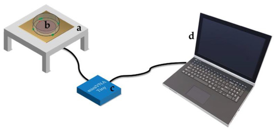 Experimental setup based on (a) sensors, (b) Petri dish in which cells or pure medium are placed, (c) the MiniVNA, and (d) a notebook for data acquisition.