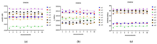 To provide a visual representation of the statistical parameters, Figure 2 showcases an example of these parameters computed over the ten consecutive acquisitions for the minimum return loss (minRL), resonant frequency (fr), and full width at half maximum (FWHM) for one DMEM sample. The main statistical parameters in the figure are the mean value, standard deviation, and error of the first measurement (EFM).