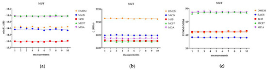 Figure 4 presents, as an example, the ten consecutive measurements obtained for one sample for each tested group: DMEM, SaOS-2, 143B, MCF-7, and MDA-MB-231. The measurements are displayed for the three fitting parameters (minRL, fr, FWHM). The linear trend line is also included for each replicate.