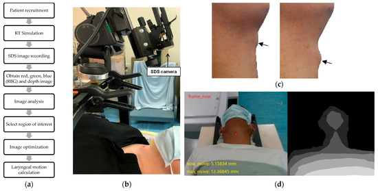 Given the progress in advancing technologies, an increasing number of techniques are investigating laryngeal movement. One study conducted by Huynh et al. revealed laryngeal motion can be tracked and gated by the cine MR in the MR-Linac [31]. Another study applied three-dimensional cameras to track 16 markers on the chin and anterior neck to evaluate the extrinsic laryngeal muscle tension and hyperfunction [32]. Zhang et al. designed a wearable swallowing recognition system based on motion and dual photoplethysmography to sense laryngeal movement [33]. Compared with the above-mentioned techniques, the SDS technique is non-labor-consuming and inexpensive because the SDS camera costs only around USD 300.