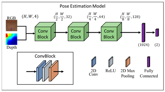 The SDS data were calculated via the Pose Estimation Model. The procedure for processing the image data was as follows (Figure 3). The input of the Pose Estimation Model was an RGBD (red, green, blue and depth) image, which was a color image that contained depth information, and the output was the predicted position coordinate in the format of (x,y). For effective and real-time tracking, we used ConvBlock in Figure 1, which is one of the commonly used modules in convolutional neural networks which could effectively extract features from images and reduce the number of parameters [24]. The model consisted of three ConvBlocks. After the three ConvBlocks, the output was flattened into a 1D vector and fed into two fully connected layers for the final prediction. The following would introduce the details of the model, including the factors considered and how the model output was transformed into real-world coordinates.