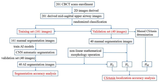 Nowadays, a few studies have explored and discussed the possibilities of applying AI techniques in upper airway analysis [26,27,28,29,30]. For example, Çağla et al. [31] developed an automatic pharyngeal airway segmentation in CBCT images by using a CNN system; a dice ratio of 0.919 and a weighted IoU of 0.993 were achieved. Antonio et al. [32] developed a fully automatic and end-to-end airway segmentation method based on the U-Net architecture, and the results showed the EXACT’09 public dataset achieved the highest sensitivity among three different test sets. And Rosalia et al. [33] applied a deep learning-based fully CNN technique to segment the sinonasal cavity and pharyngeal airway. A mean volume difference of 1.93 ± 0.73 cm3 was found between manual segmentation and AI processing.